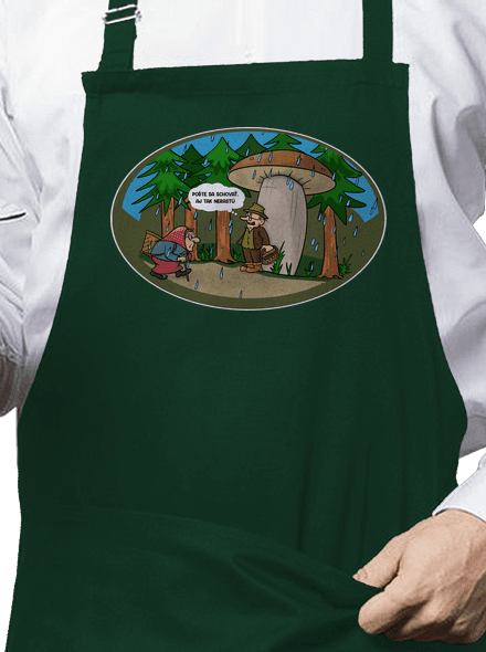 Babička a hubár pod veľkou hubou v daždi v lese. Text na potlači: Poďte sa schovať. Aj tak nerastú.