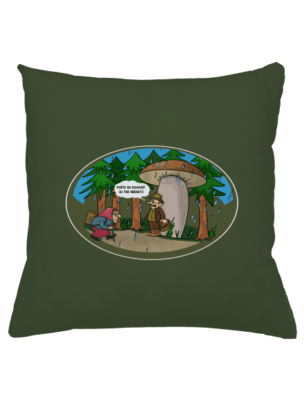 Babička a hubár pod veľkou hubou v daždi v lese. Text na potlači: Poďte sa schovať. Aj tak nerastú.