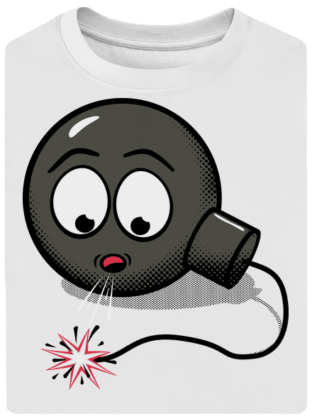 Bombu na tejto potlači čaká ešte pár horúcich chvíľ. Ocitla sa v nevďačnej úlohe harakiri útočníka, ale teraz by si to najradšej rozmyslela a nevybuchla. Lenže zapálený knot sa už nechce nechať sfúknuť. Ako sa z tejto prekérnej situácie dostať bez stráty kvetinky? Ak ťa nenapadá žiadne riešenie, môžeš bombu podporiť tým, že si objednáš tričko s jej potlačou.
