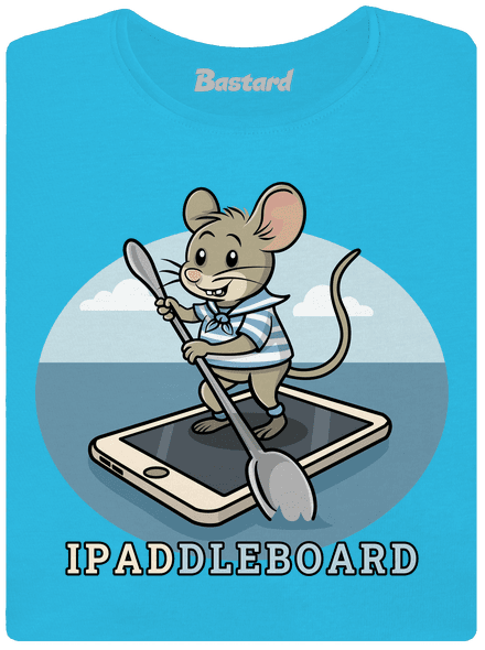 Na obrázku je kreslená myš, ktorá stojí na iPade ako na paddleboarde a drží pádlo. Vtip spočíva v slovnej hračke "iPad" a "paddleboard", ktoré sú spojené do slova "iPaddleboard". Myš používa iPad ako improvizovaný paddleboard, čo je humorné vďaka tejto vizuálnej a slovnej hračke.