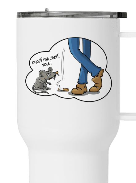 Myš reaguje na odhodený vajgl. Text na potlači: Chceš ma zabiť, vole!