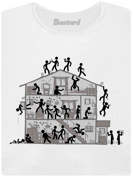 To je panečku párty! Tancuje sa aj na streche, nechýba dobrá hudba, veľa alkoholu, nejaké tie myši, a samozrejme ani zvracanie a držkopády. Skrátka a dobrá párty ako sa patrí. Kto ale ten dom ráno uprace, to je vo hviezdach. Neboj sa, ak si kúpiš tričko alebo bundu s touto potlačou, táto epická party nikdy neprestane, vďaka sieťotlače zostane na tvojom oblečení ako pribitá.