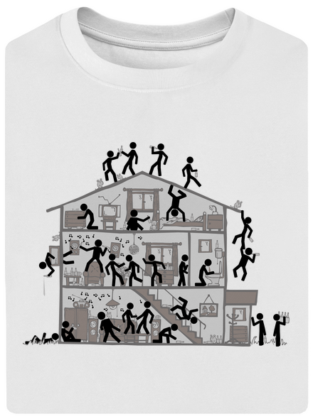 To je panečku párty! Tancuje sa aj na streche, nechýba dobrá hudba, veľa alkoholu, nejaké tie myši, a samozrejme ani zvracanie a držkopády. Skrátka a dobrá párty ako sa patrí. Kto ale ten dom ráno uprace, to je vo hviezdach. Neboj sa, ak si kúpiš tričko alebo bundu s touto potlačou, táto epická party nikdy neprestane, vďaka sieťotlače zostane na tvojom oblečení ako pribitá.