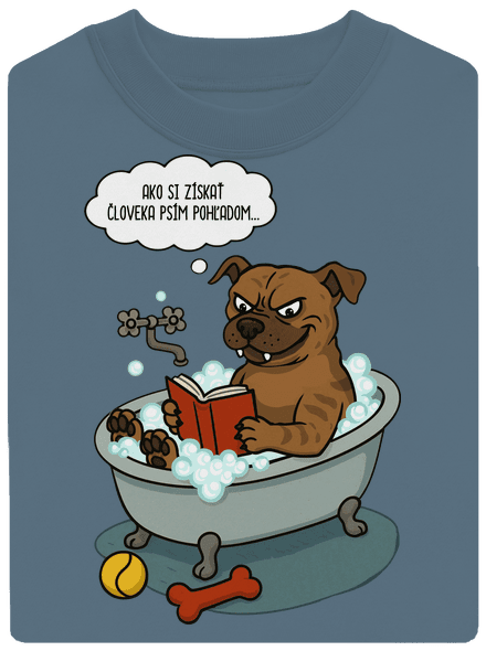 Potlač „Ako si získať človeka psím pohľadom“ ukazuje, že aj drsniak má svoj plán. Pes vo vani so zákerným výrazom študuje príručku, ako ovládnuť pána pohľadom. Pretože kto ovláda oči, ovláda granule…