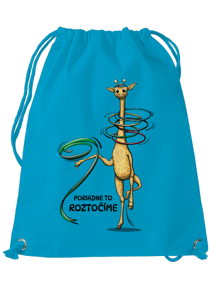 Žirafa cvičí modernú gymnastiku. Točí sa stuhou a kruhmi, ktoré pripomínajú olympijské kruhy. Text v potlači: Poriadne to roztočíme.