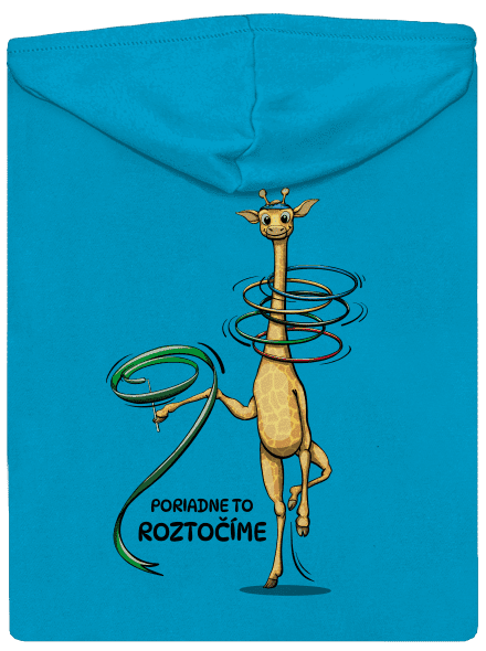Žirafa cvičí modernú gymnastiku. Točí sa stuhou a kruhmi, ktoré pripomínajú olympijské kruhy. Text v potlači: Poriadne to roztočíme.