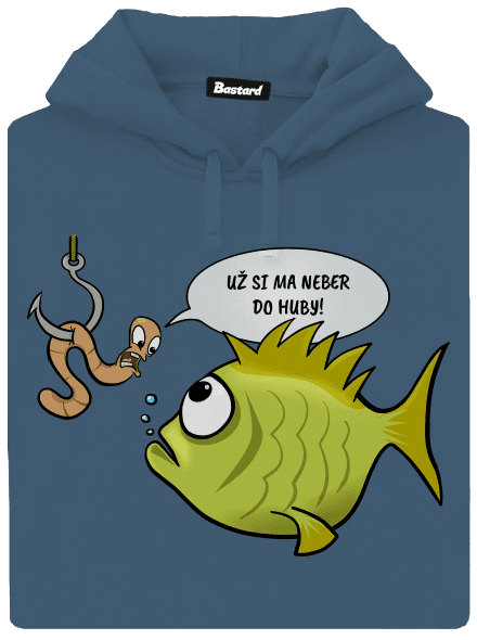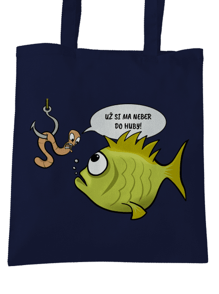 Potlač vhodná nielen pre rybárov. Grafika zachytáva ľahkosť situácie, ktorá je inak pre obe postavy celkom napätá. Text v grafike: Už si ma neber do huby.