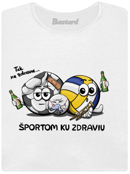Potlač Športom ku zdraviu predstavuje vtipnú scénu, kde lopty z rôznych športov - futbalová, baseballová a volejbalová - sú stvárnené ako postavičky, ktoré si pripíjajú na zdravie, hoci samy majú drobné športové zranenia. Futbalová lopta je zošliapnutá s náplasťou, volejbalová má nohu v sadre a baseballová lopta trpí nádchou. Tento humorný design je skvelým pripomenutím toho, že šport je niekedy tvrdý, ale vždy stojí za to. Ideálne tričko pre každého, kto má rád šport a neberie si drobné zranenia príliš vážne! Tak na zdravie.