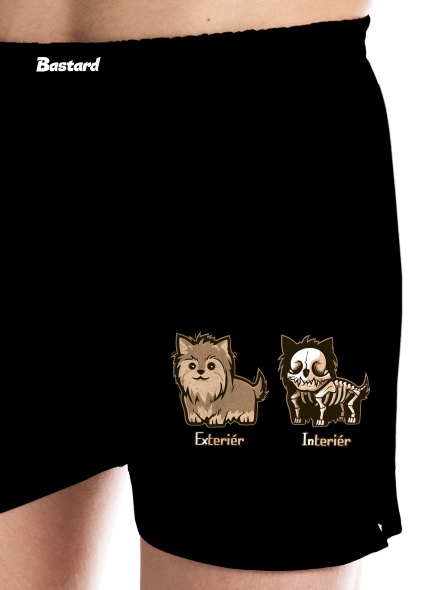 Teriér je nezvyčajne pestrým psím plemenom. Napriek tomu ho môžeme pomerne ľahko rozdeliť do dvoch základných kategórií. Tzv. exteriér, to je teriér videný zvonku, presne v takej tej roztomilej podobe, ako sme ho zvyknutí vídať. Zato Interiér, to je psík, ktorého môžeme vidieť pod röntgenom alebo tiež nešťastník, ktorého spriehľadnil náhodný blesk v letnej búrke. Interiér neskryje takmer nič zo svojho vnútra. Či už fandíte tomu, alebo onomu, toto tričko vám zaiste urobí radosť.