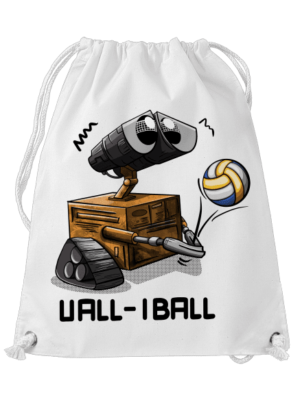 Na obrázku je ilustrácia robota, ktorý pripomína Wall-I z filmu rovnakého mena. Odpaľuje volejbalovú prihrávku. Text v grafike hovorí "VALL-IBALL," čo je vtipná slovná hračka kombinujúca meno robota Wall-E s anglickým slovom "volleyball" (volejbal).