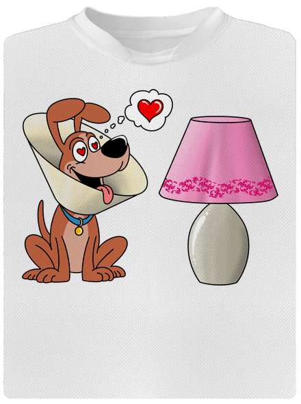 Na obrázku je pes s ochranným golierom, ktorý vyzerá podobne ako tienidlo lampy. Lampu si teda mylne pomýlil s fenkou do ktorej sa zamiloval.